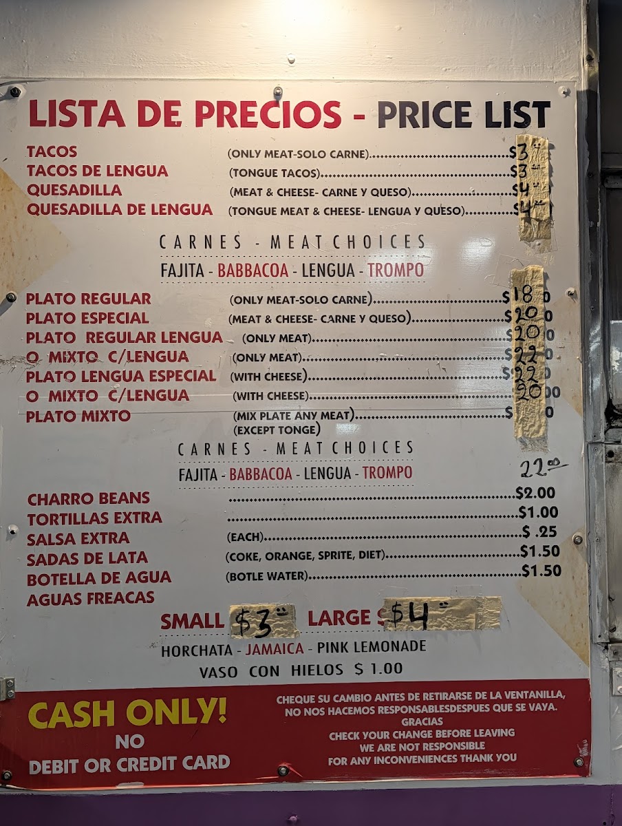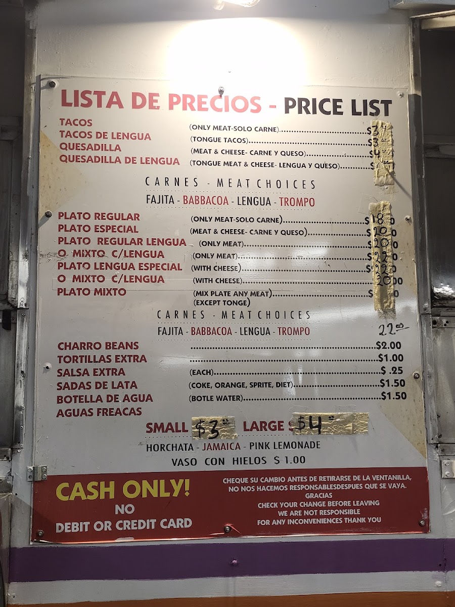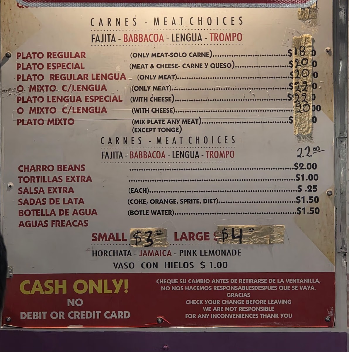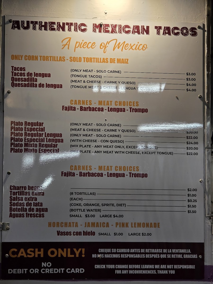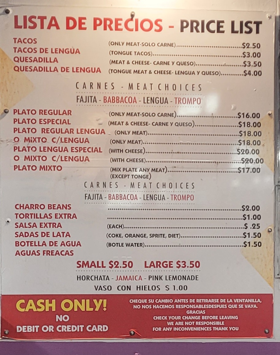 Accompany these savory dishes with traditional sides like Charro Beans or an extra order of tortillas, and complement your meal with refreshing aguas frescas including Horchata, Jamaica, or Lemonade. The drinks lineup also includes familiar soda choices served in cans, rounding out a menu that stays true to simple, authentic flavors.